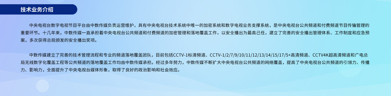 2018年10月開始,中數(shù)傳媒負(fù)責(zé)中國首個上星超高清電視頻道—中央廣播電視總臺4K超高清頻道的傳輸和落地宣傳工作,基本實現(xiàn)了中央廣播電視總臺4K超高清頻道的全國覆蓋。